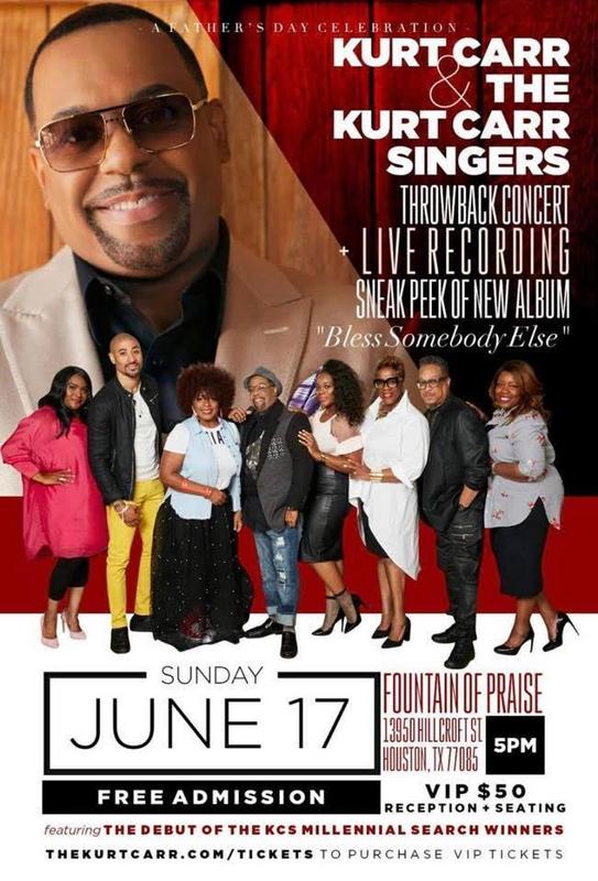 Kurt Carr (best known for hit songs such as “In the Sanctuary”“I Almost Let Go”, and “For Every Mountain”), is set to record his 9th album entitled, “Bless Somebody Else,” live on Sunday, June 17th at Fountain of Praise Church in Houston, TX. The recording is scheduled to begin at 5pm and will be in tribute to Father’s Day, celebrating Fathers and giving back to the community.